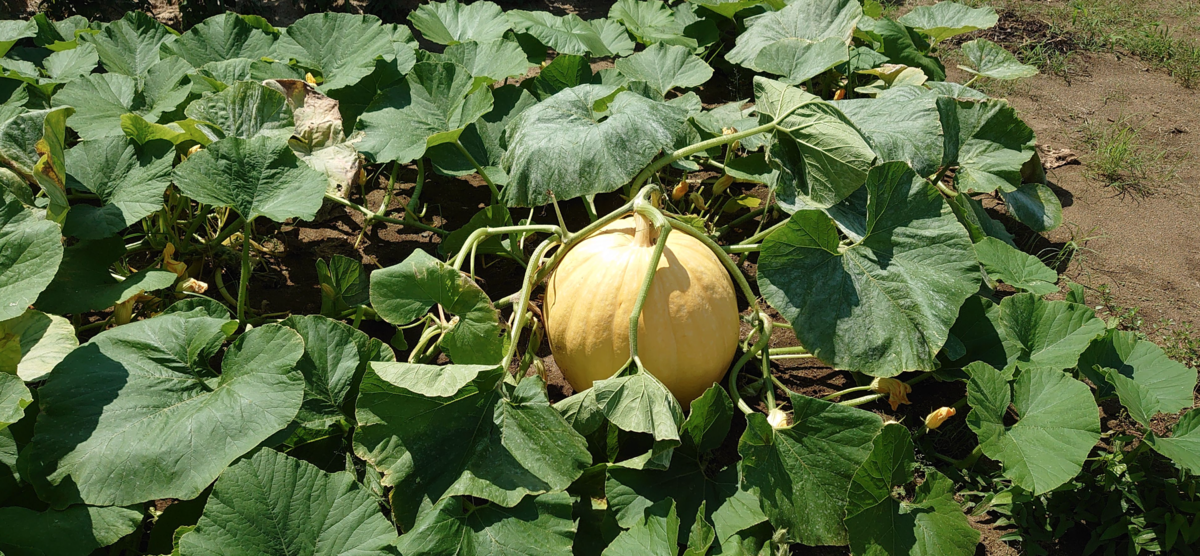 6月、苗に本葉が出てきたところで畑への定植をした。これもやり方は食用かぼちゃと変わらない。