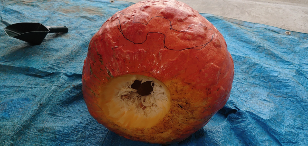 ノリで始めたデカかぼちゃ作りだが、実際に現物が出来てしまうと運搬の問題に直面した。重さもあるが球体なので1人で抱えるのには難があり大きいものは複数人で運ぶしかない。運ぶときにはブルーシートなどに載せてシートの四隅を持って運んだりすると楽だった。