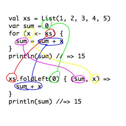 foldLeft って map, filter, foreach といった他の高階関数に比べて難しい気がします。多分いきなり「畳込み」とか「アキュムレータ」とか言うからだめで、手続き脳フレンドリーな言い方は「ループの変形」なんじゃないかと思いました。実は書くだけだったら…